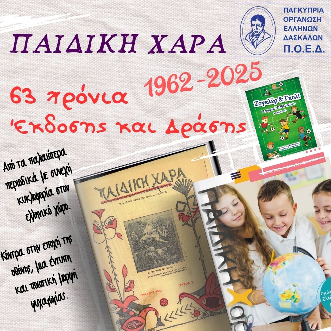 Το περιοδικό της ΠΟΕΔ, Παιδική Χαρά, θα είναι και φέτος στα σχολεία μας, ένα περιοδικό με περισσότερα από 63 χρόνια ζωής, απόδειξη της διαχρονικής αξίας του περιοδικού και της συμβολής του στην ποιοτική ψυχαγωγία γενεών και γενεών. Επιπλέον, η Παιδική Χαρά αποτελεί ένα από τα παλαιότερα περιοδικά με συνεχή κυκλοφορία στον ελληνικό χώρο.